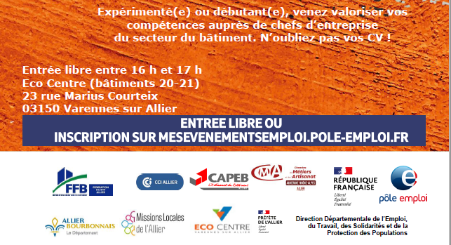JOB DATING BATIMENT à l'Eco Centre de Varennes/Allier 12 octobre 2022 • 16:00 → 17:00 Eco Centre de Varennes/Allier 23 rue Marius Courteix (bâtiment 20-21) 03/10/2022