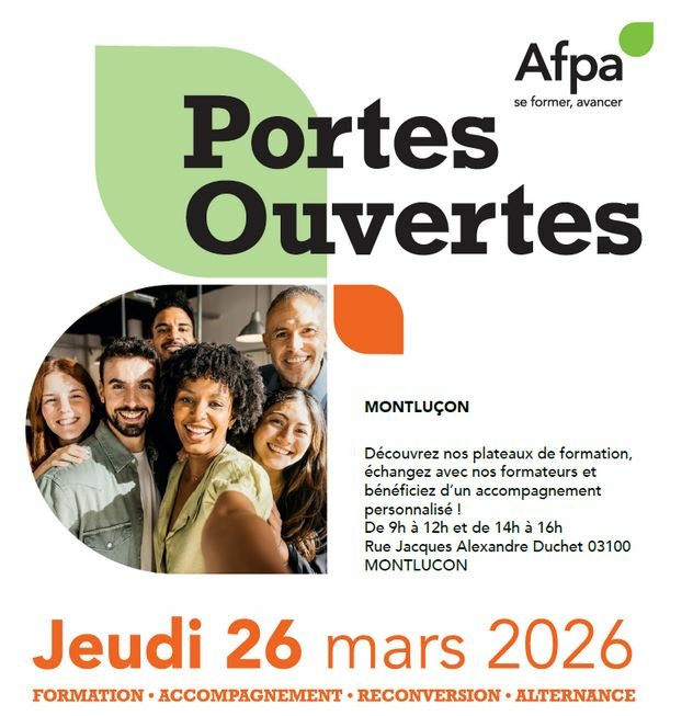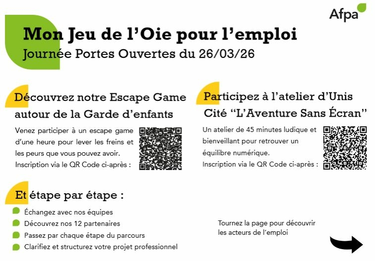 Portes ouvertes à l'AFPA de Montluçon : un format innovant 26 mars 2026 → 23:59 AFPA Montluçon - Rue Alexandre Duchet Si le QR Code ne fonctionne pas lien avec l'atelier d'Unis Cité "L'aventure Sans Ecran" Document téléchargeable Mon Jeu de l'Oie pour l'emploi - JPO 26.03.2026-2.pdf 1.10 Mo le service Insertion vers Emploi du Département de l'Allier 13/03/2026