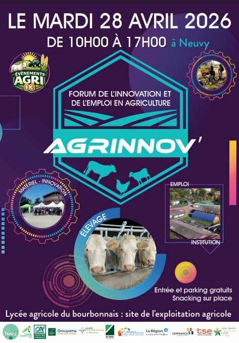 AGRINNOV : forum de l'innovation et de l'emploi en agriculture 28 avril 2026 • 10:00 → 17:00 Lycée agricole du Bourbonnais à Neuvy : site de l'exploitation agricole Document téléchargeable Plaquette AGRINNOV' 2026.pdf 604.39 Ko le service Insertion vers Emploi du Département de l'Allier 15/04/2026